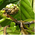 Morinda citrifolia is infected by Phytophthora Blight, black flag disease (Phytophthora species) which causes the foliage to turn black and limp. The fruit and stems are also infected causing them to turn brown-black and whither.