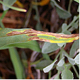 The infected areas become thin and papery while the lower leaf forms oval brown spots. As the spots enlarge the enclosed tissue turns white and dies. The leaf generally has a pale green washed out appearance and a heavy infection causes the leaf to bend and die.