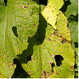 Grape leaves, flowers and fruit are attacked with the appearance of greyish-white powdery spots. Infected flowers set poor quality fruit and infected fruit splits open and dries out.