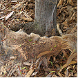 Stem Canker of Red Flowering Gum (Sporotrichum destructor) enters through wounds in the bark forming cankers in the trunk and branches, splitting the bark apart, revealing the wood and infesting the surface with powdery spores. This infection causes the leaves to wither and then the branches die, eventually killing the tree.