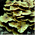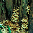 This naturally occurring fungus grows between the bark and wood of trees producing distinctive cream sheets of hyphae. The toadstool-like fruiting bodies are yellowish brown and appear from the soil or sprout out of the base of the host plant.