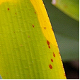 Older plants that are attacked produce new foliage that is mottled with bronze colouring which soon turns black causing the leaf to shrivel and die. Stems can also be affected with brown streaks and fruit of an infected plant, ripens unevenly and is marked with circular blotches. This may cause premature fruit fall.