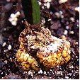 The fungal attack can occur below (pre-emergence) before the seedling appears or above soil level (post-emergence) as the seedling develops cotyledons. The rot occurs on the roots and can move into the stem making the seedling to topple or the fungus attacks the outer layer of the stem only leaving a thin cord to support the plant (wire-stem). It may also produce fine threads that spread from the top of the seedling to other seedlings. In succulent nursery stock the fungus rots the roots causing the death of the plant.