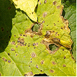 The leaf develops small brown corky areas that have a scabby appearance. It commonly occurs in damaged areas of the leaf ie: torn or broken leaf parts and where insects have attacked.