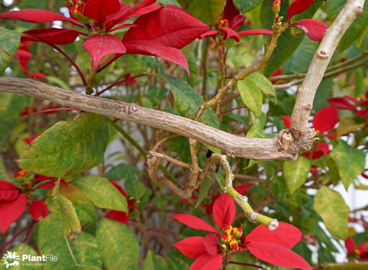 Poinsettia is grown for its colourful bracts and its rounded bushy habit. It is planted along garden borders for screening or used as a specimen plant in a tropical setting. It may also be used as a small shade tree and is commonly used as a potted house plant. It has a moderate growth rate establishing in 2 to 3 years and there are many cultivars available. Care should be taken as the sap is mildly poisonous if ingested and if touched it can cause dermatitis (use gloves). It has a medium water requirement once established responding to mulch and an occasional deep watering during dry periods.
